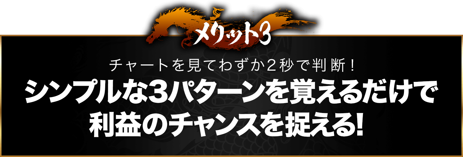 そして、ここであなたが学ぶのは、チャートをみてわずか2秒で判断できるというシンプルさ。しかも、たった3つのパターンを覚えるだけでOK。インジケーターは一切使わずに、難しいことを考える必要もありません。まるでゲーム感覚で稼ぐような手法は、いまも多くの成功者を生み出しています。